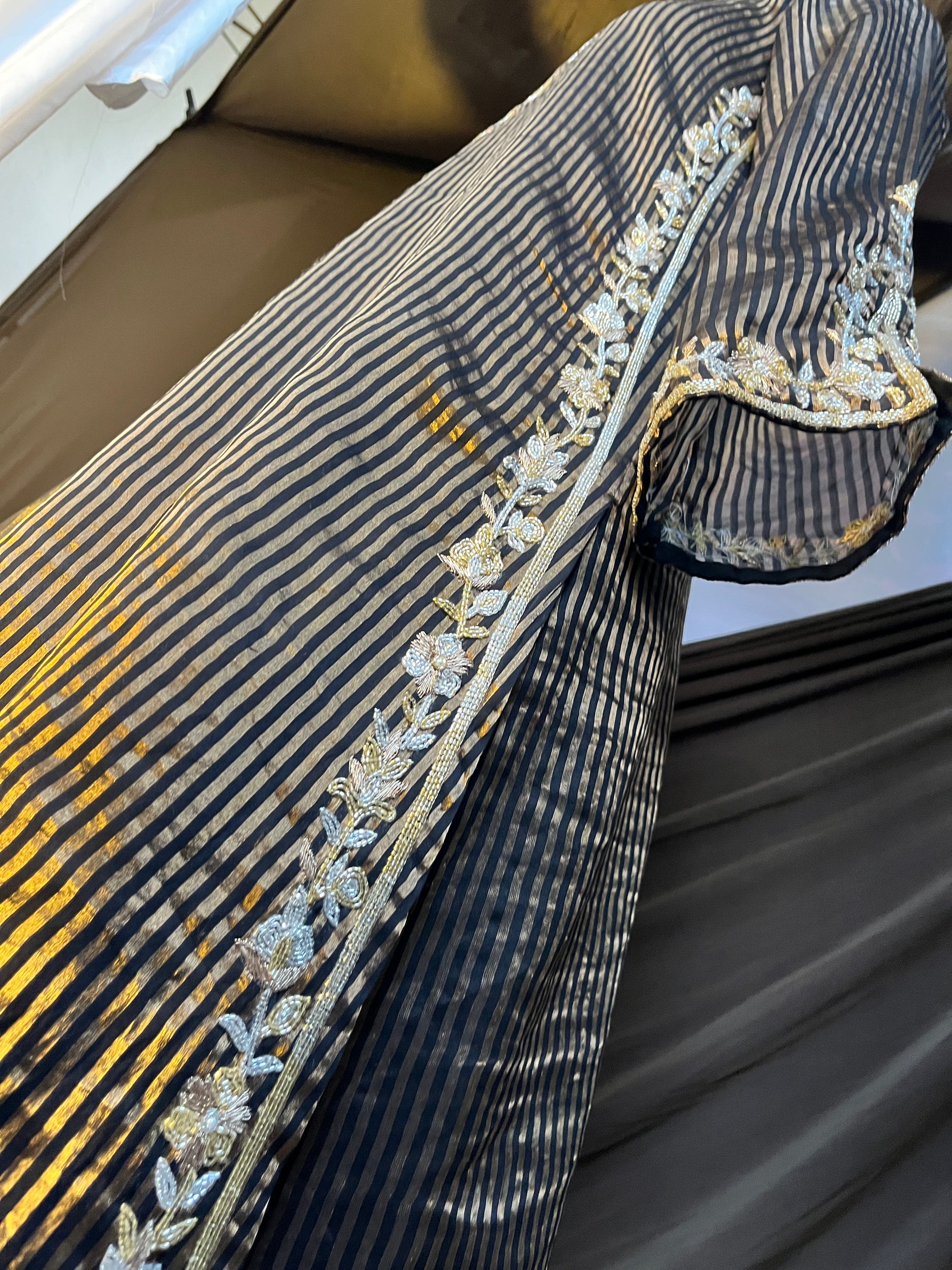 Step into festive luxury with our exquisite black & gold kurta set, crafted in premium tissue fabric for a soft, regal drape.
