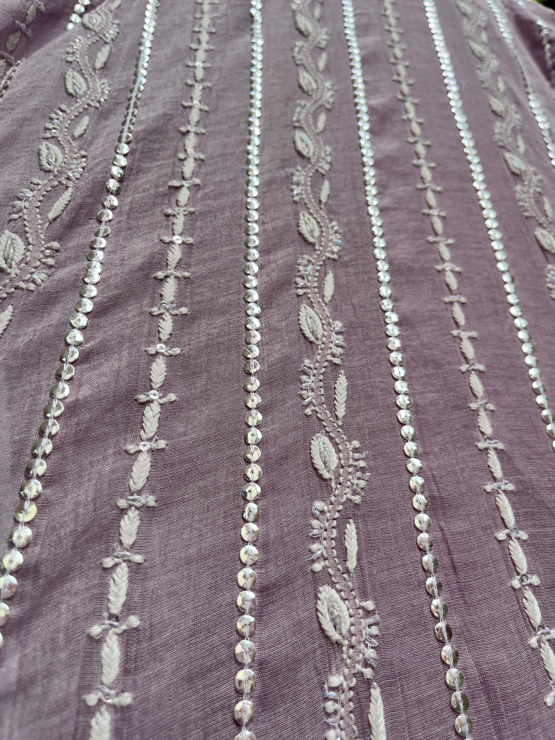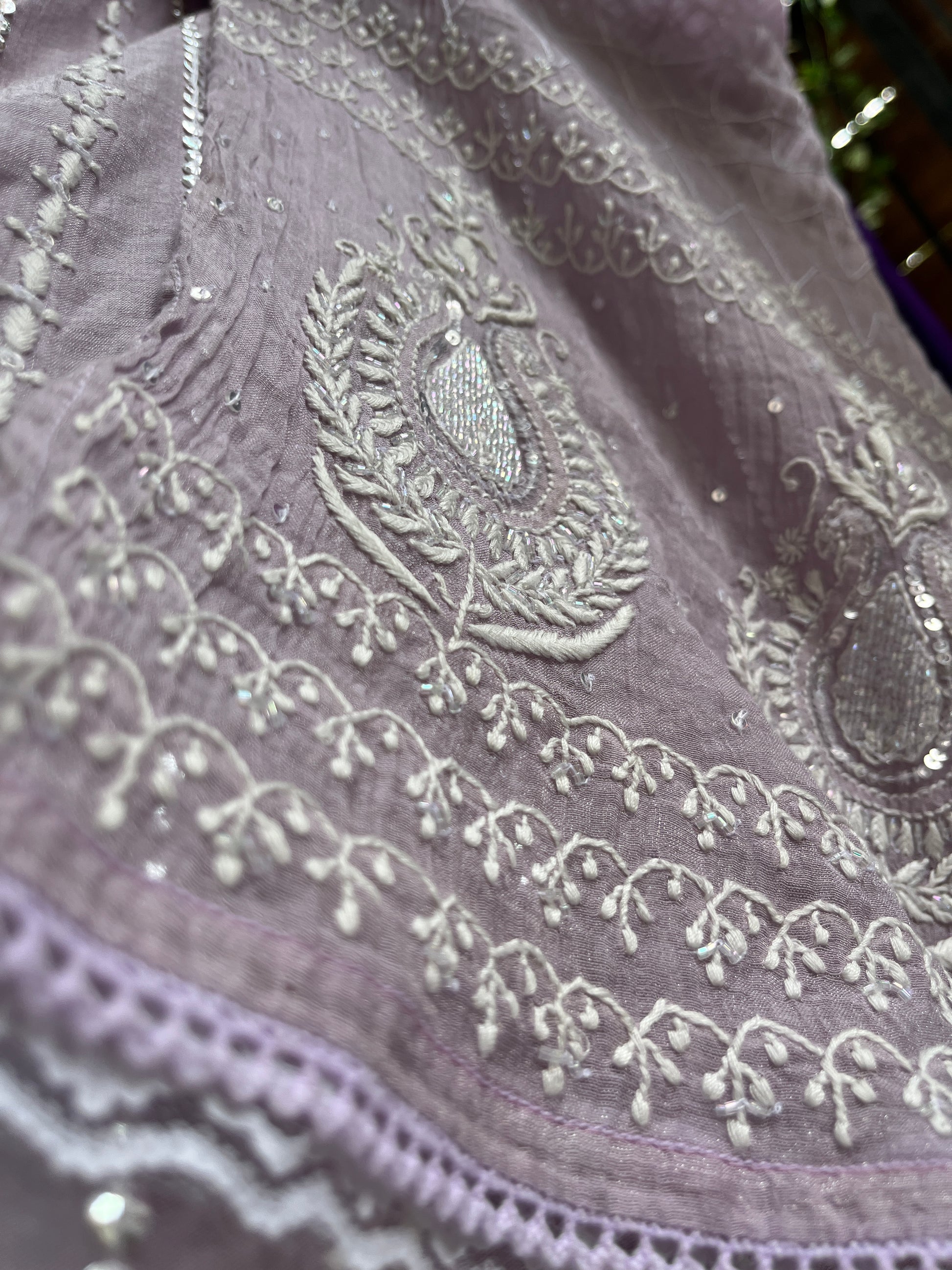 Step into timeless elegance with this light purple Anarkali, crafted in luxurious pure silver tissue fabric. The outfit beautifully blends traditional craftsmanship with contemporary grace, featuring hand-embroidered Chikankari patterns enhanced by intricate Cutdana detailing that adds a subtle sparkle to the ensemble. ✨