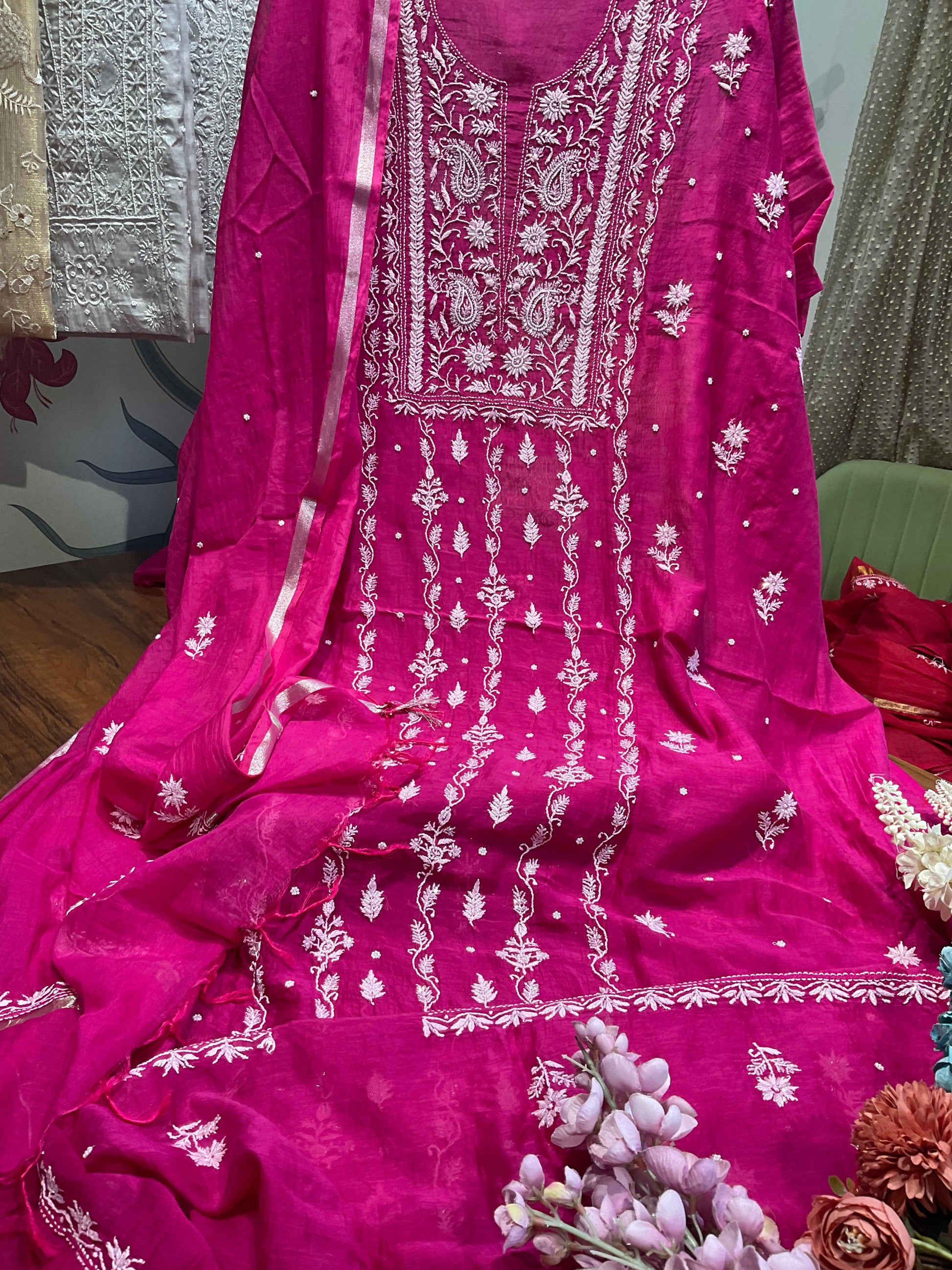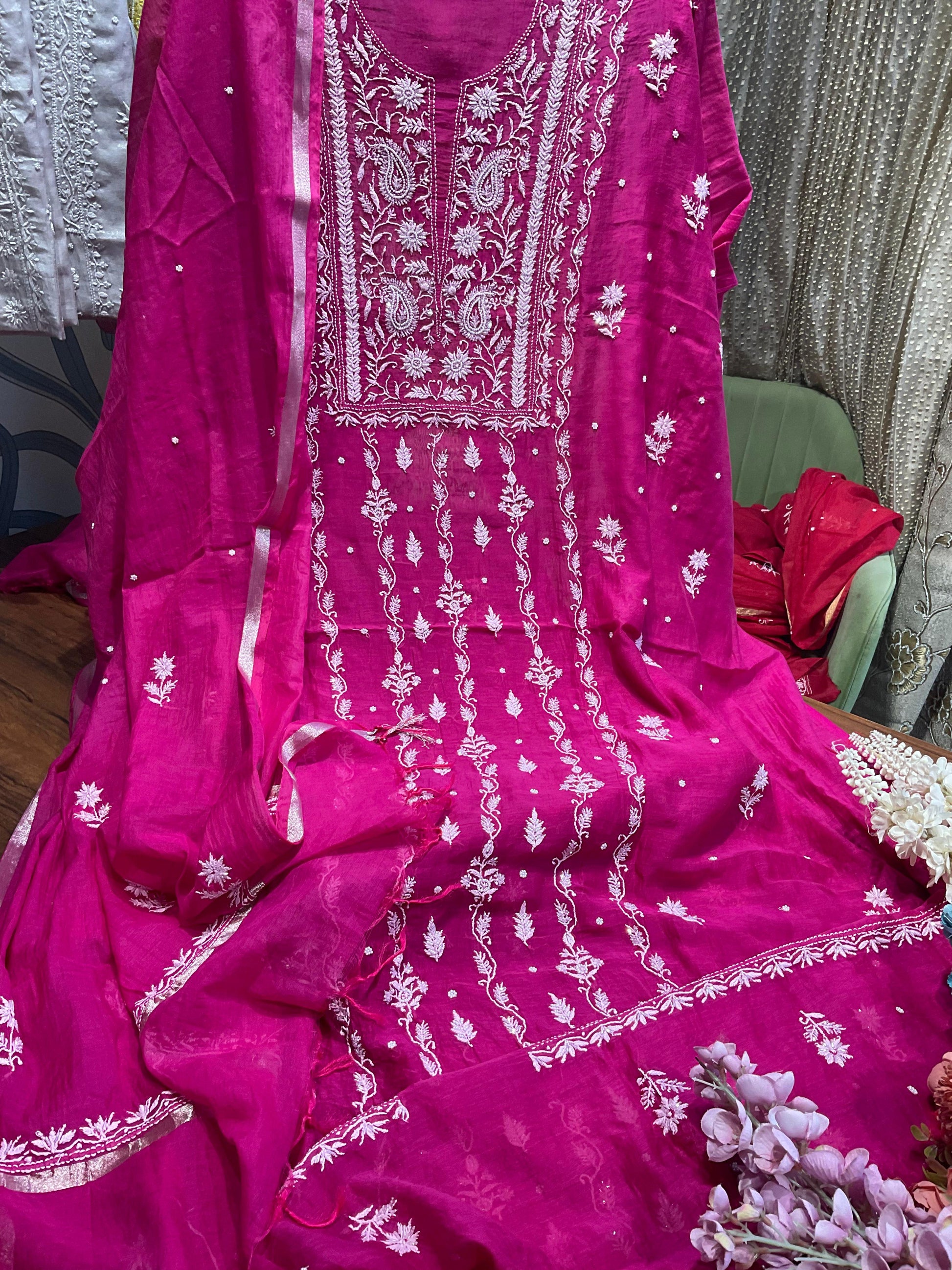 - Coordinating mulmul dupatta with delicate Chikankari motifs