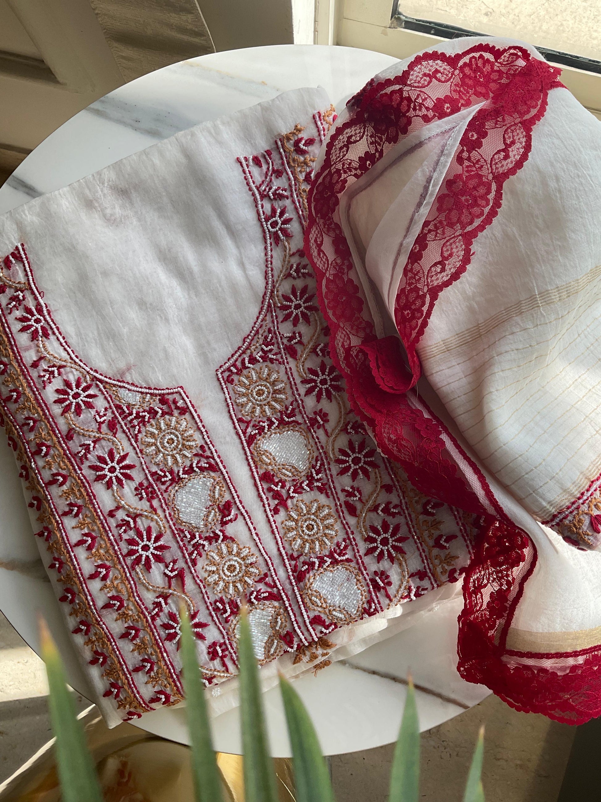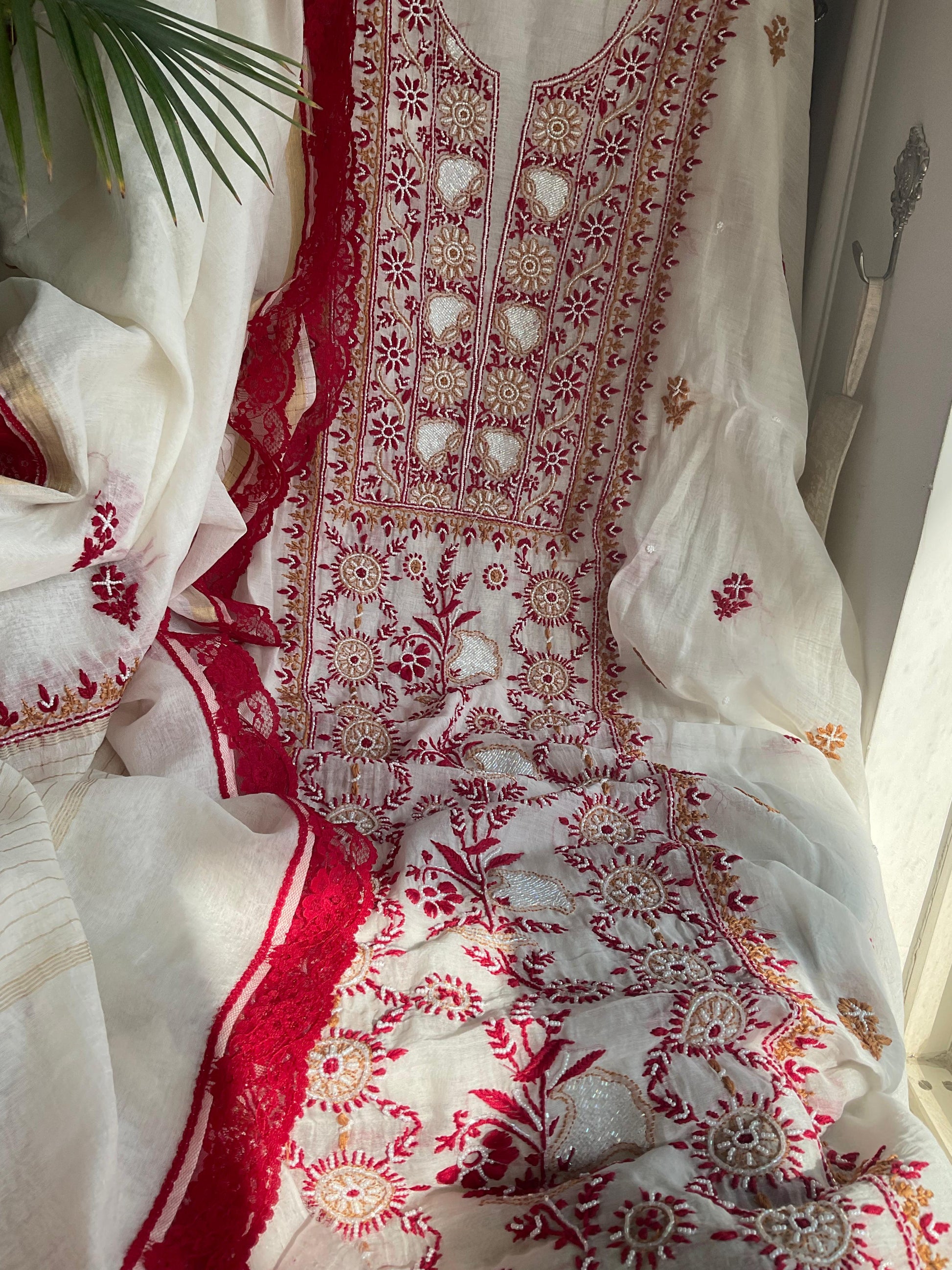 Mulmul Chikankari Kurta Set with Pearl & Cutdana Work (Set of 3) (Unstitched)