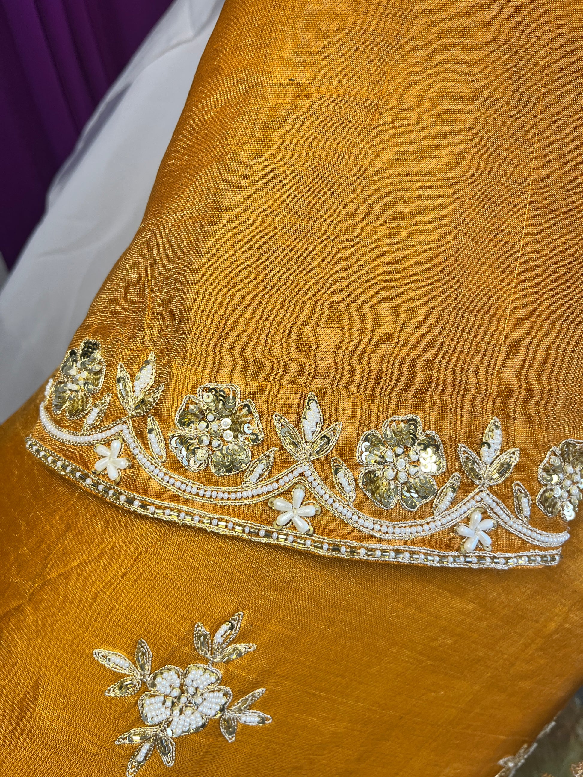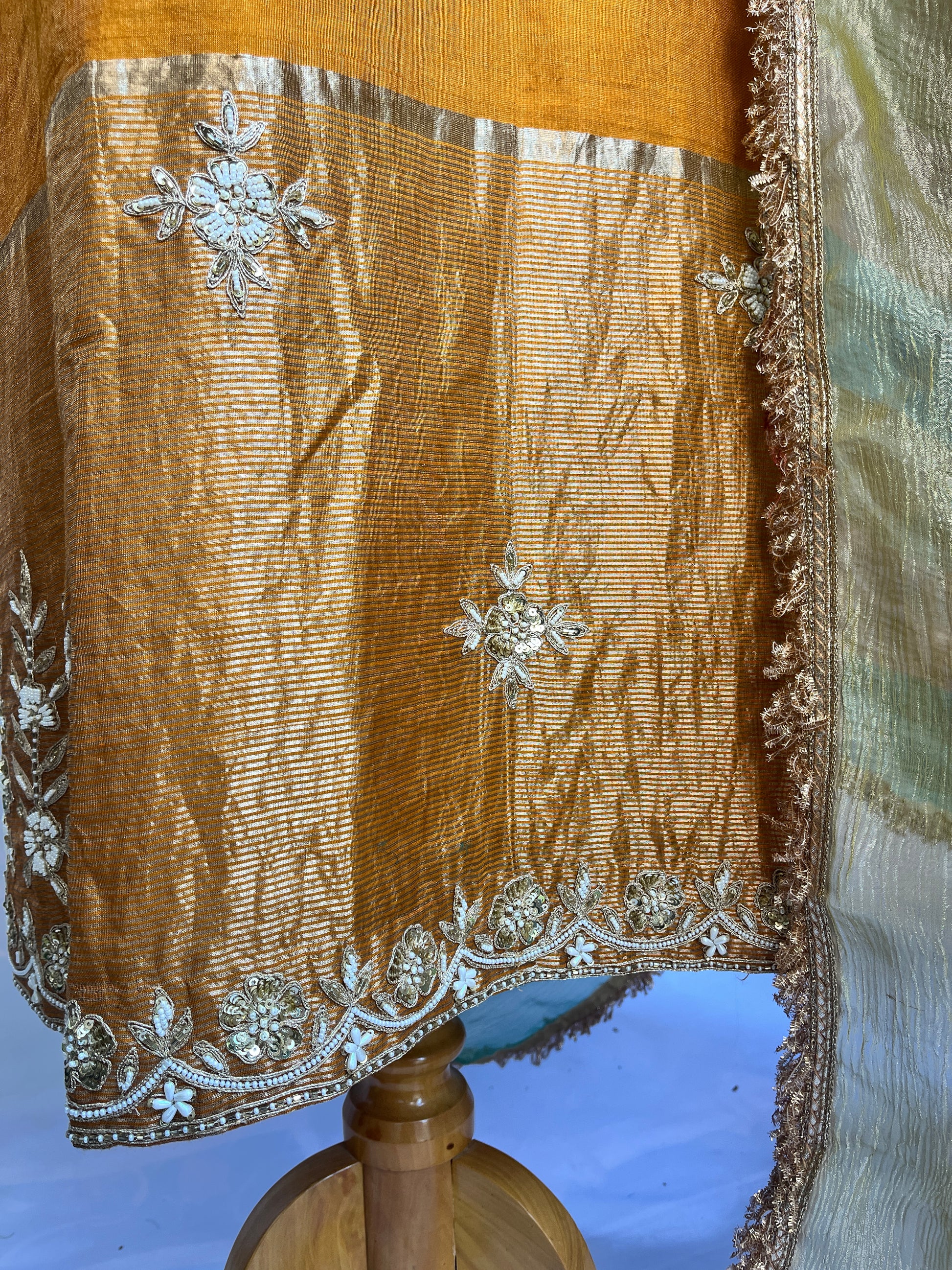 Elevate your festive wardrobe with this breathtaking mustard tissue kurta set.