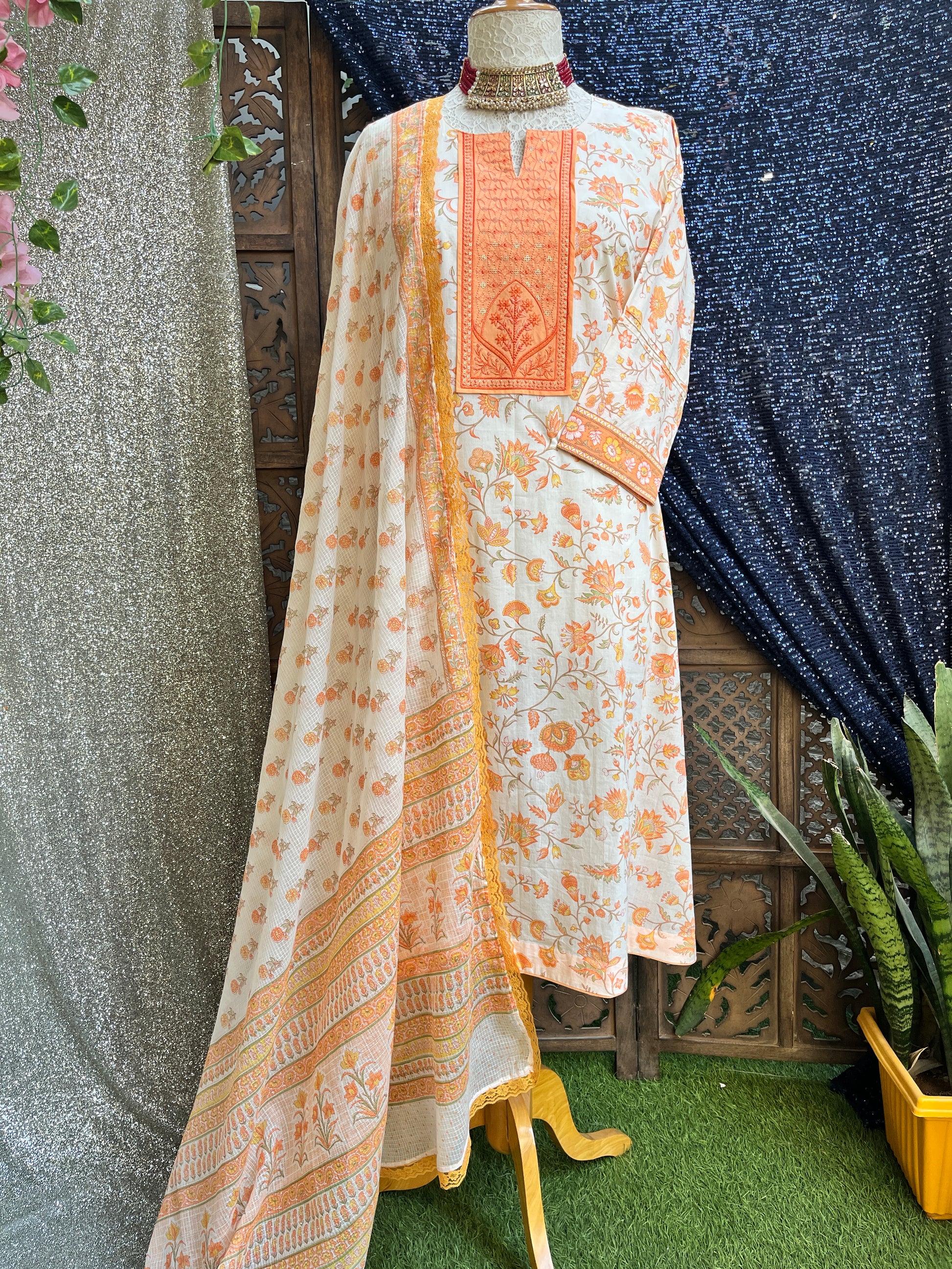 Bring effortless elegance to your wardrobe with this sunlit orange floral printed kurta set, crafted for women who love comfort wrapped in charm. The kurta features a soft flowy silhouette highlighted by delicate tanch handwork on the neckline, adding a graceful artisanal touch to the vibrant print.
