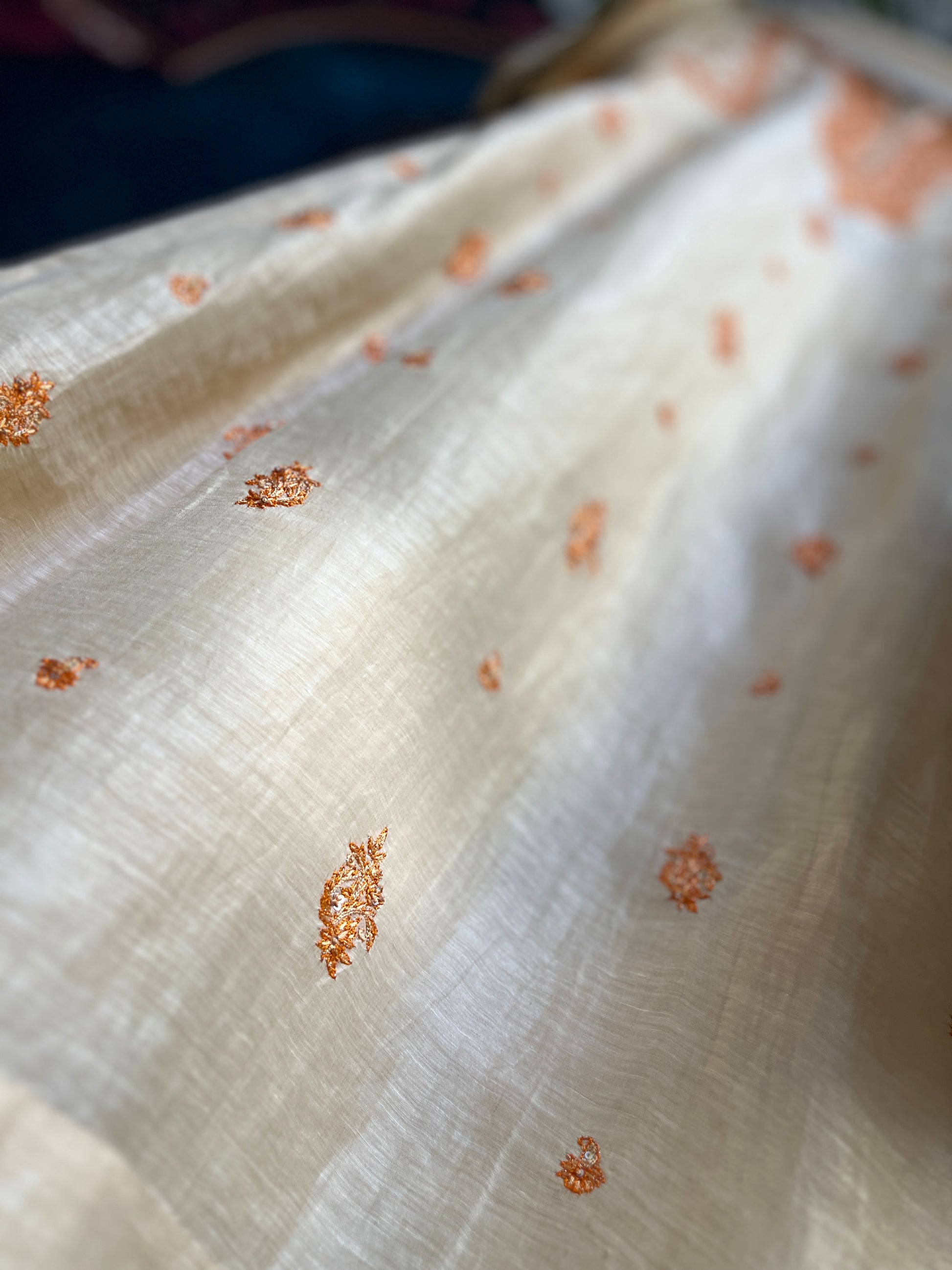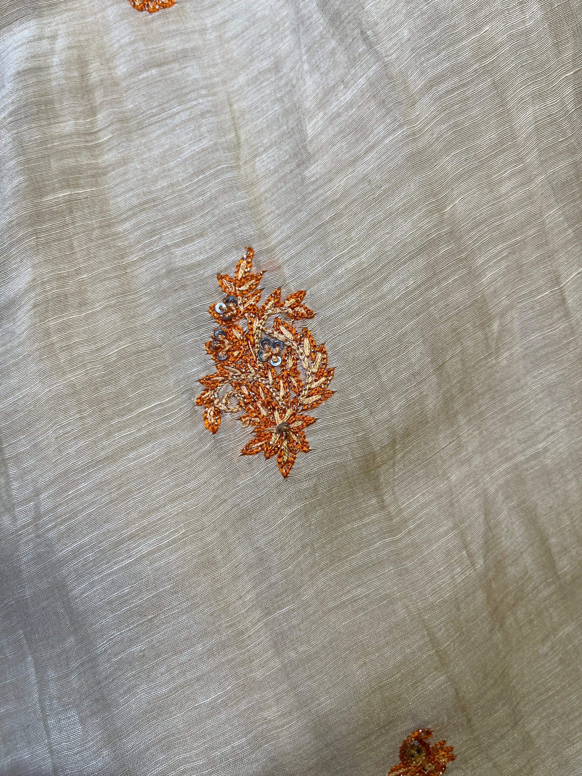 Adorned with delicate sequence, thread, and chikankari work, each detail tells a story of skilled artistry and timeless charm. The look is completed with a lightweight organza dupatta, adding a graceful touch to your ensemble.