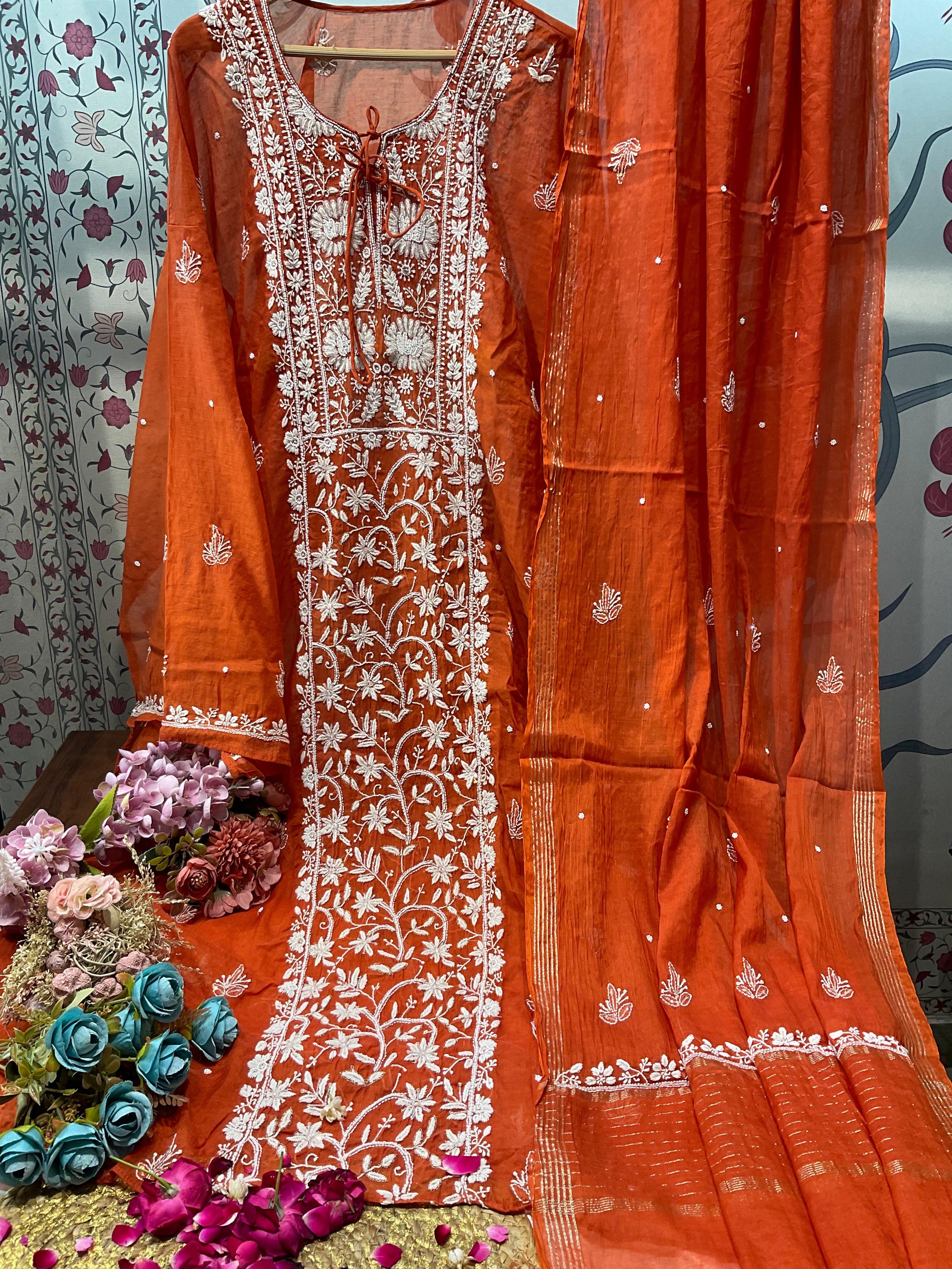 Mulmul kurta and dupatta in with fine Chikanakri pearls n cutdanas in centre panels