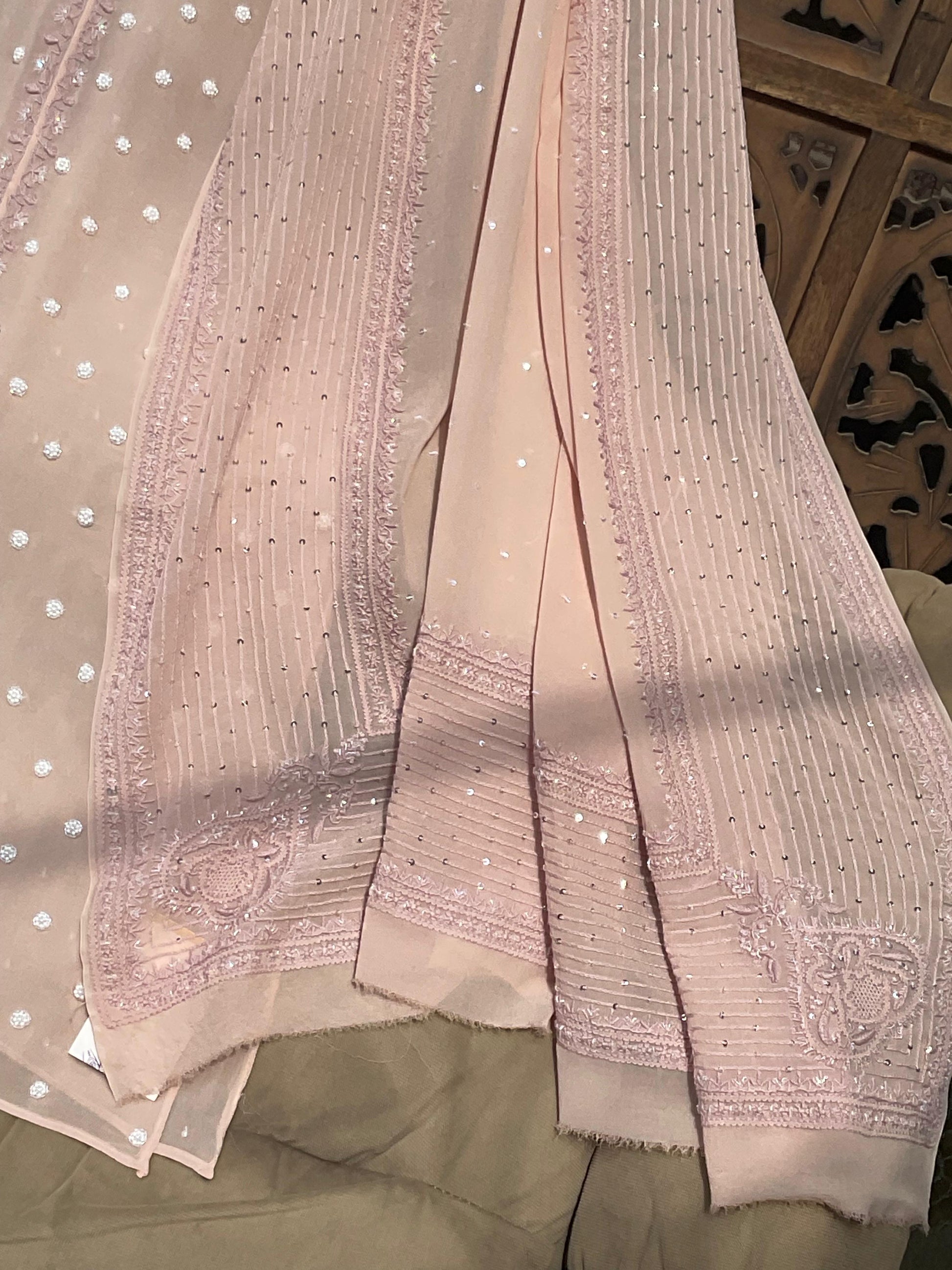 Regal Blush Pink Georgette Chikankari Kurta Set with Haath Jaali & Aari Work (Set of 3) (Semi-stitched)