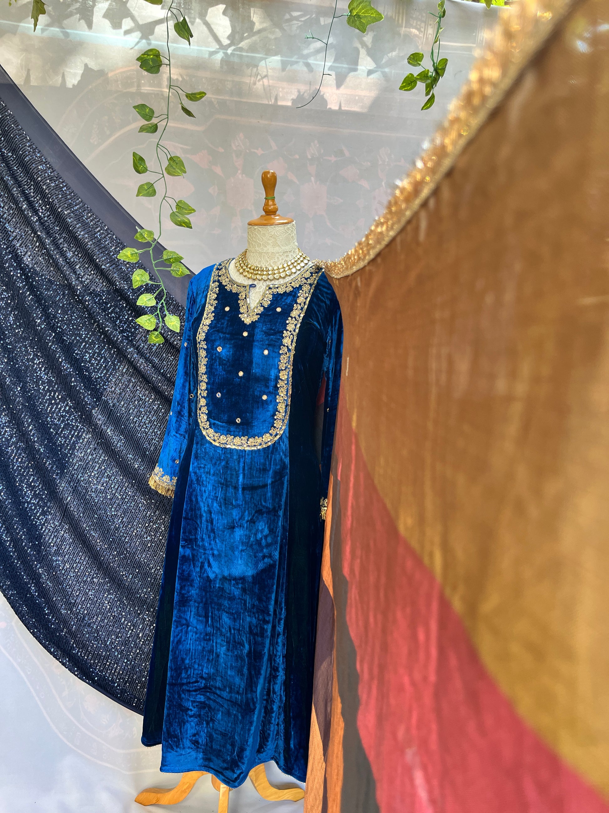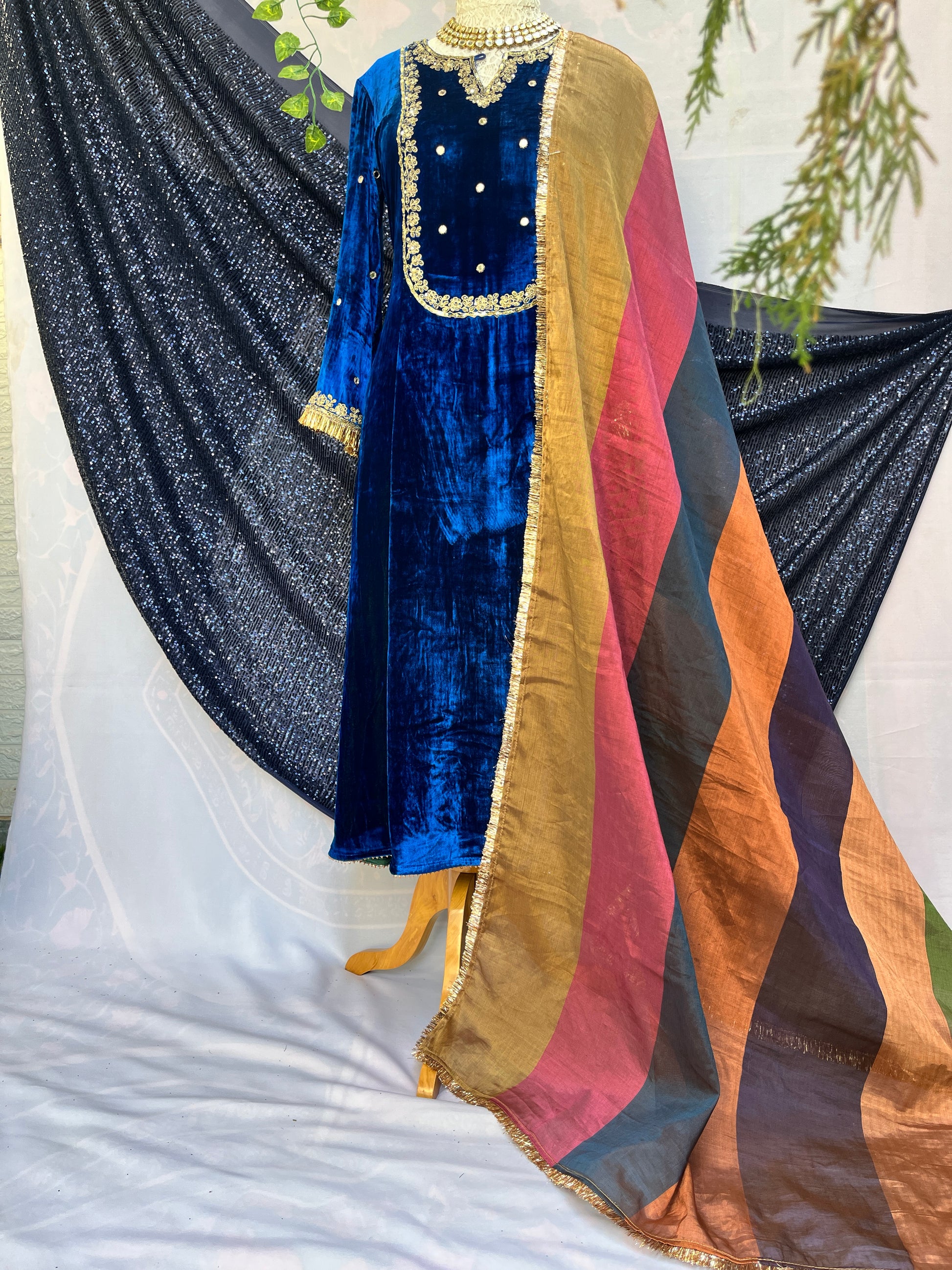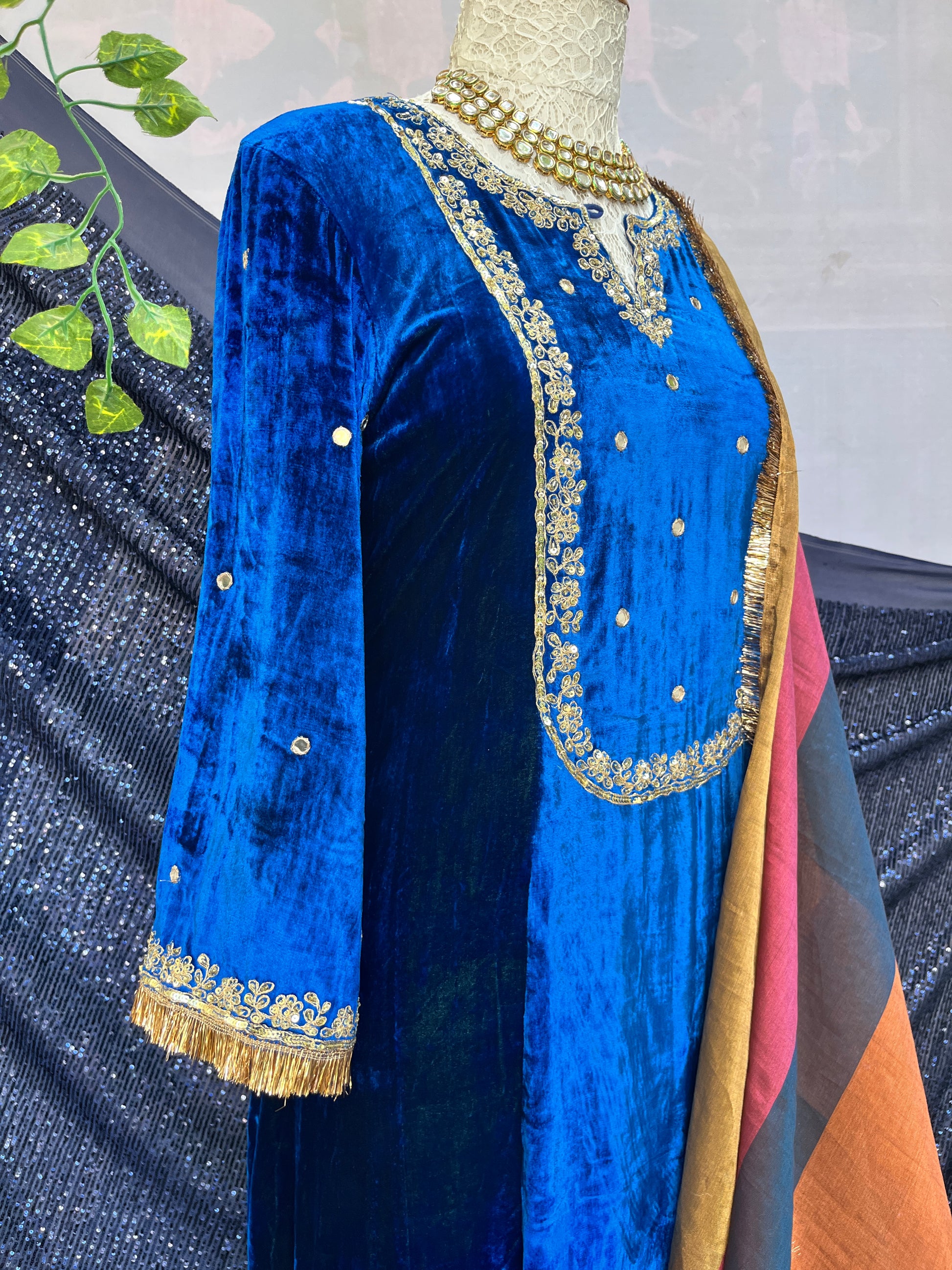Step into timeless sophistication with our Regal Silk Velvet Suit with Ethereal Tissue Dupatta, a masterpiece from our Vibrant Festive Collection. Crafted in rich silk velvet, the A-line kurta is a vision of luxury, adorned with intricate dori and hand embroidery that showcases the skill of our artisans. The delicate mirror embellishments add a subtle sparkle, making it perfect for festive and celebratory occasions.