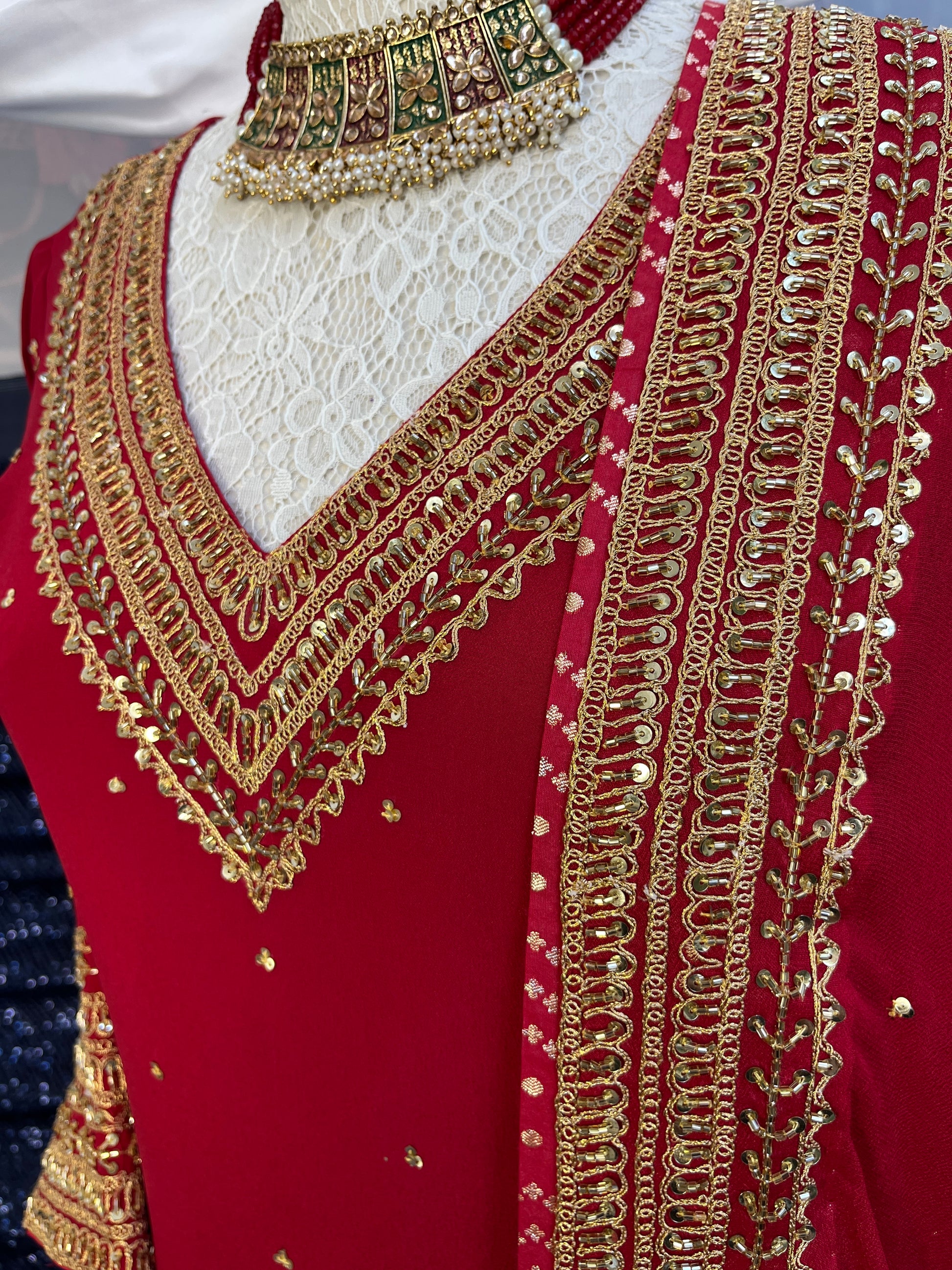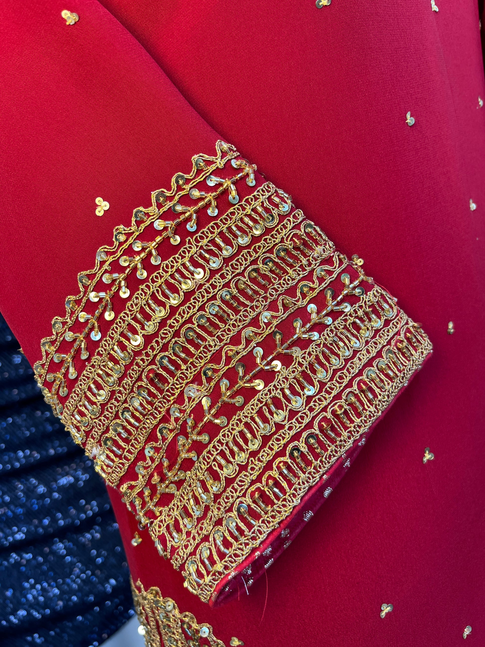 The rich red hue exudes confidence and sophistication, while the handcrafted detailing ensures you shine with understated glamour — the hallmark of Karigari Couture.
