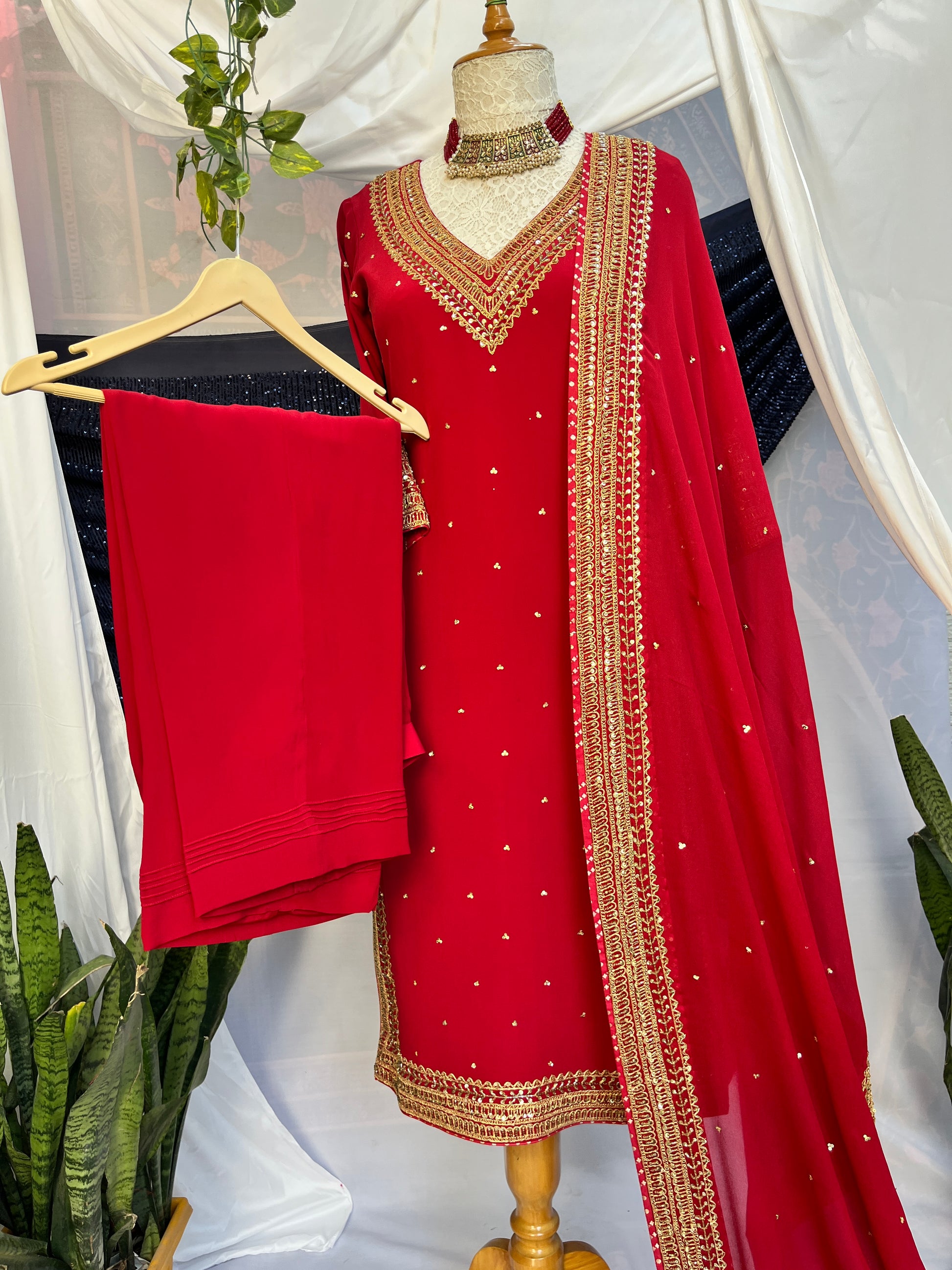 The kurta features intricate handwork of cutdana, sequins, and golden dori embroidery, creating a regal yet refined look. The soft georgette dupatta is delicately embellished along the borders, adding fluid grace and luxury to the ensemble. Every stitch speaks of skilled craftsmanship and attention to detail, making this outfit perfect for festive occasions, intimate celebrations, or evening gatherings.