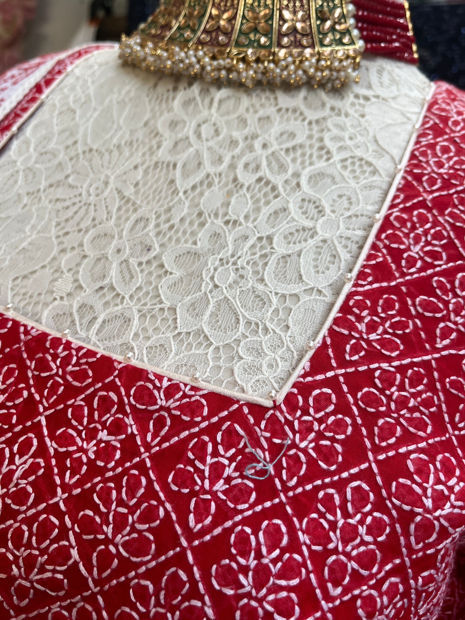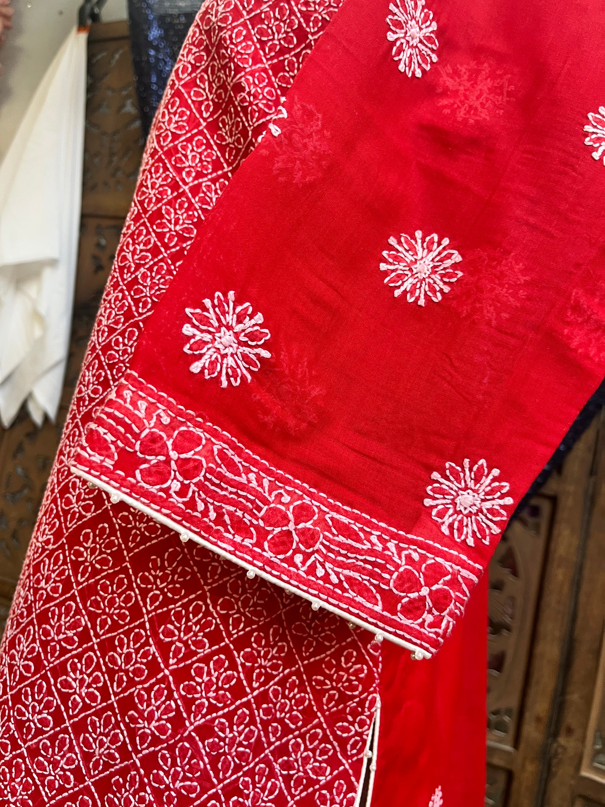 This beautiful red short kurta set is crafted in soft cotton and adorned with hand Chikankari thread embroidery that adds depth and elegance.