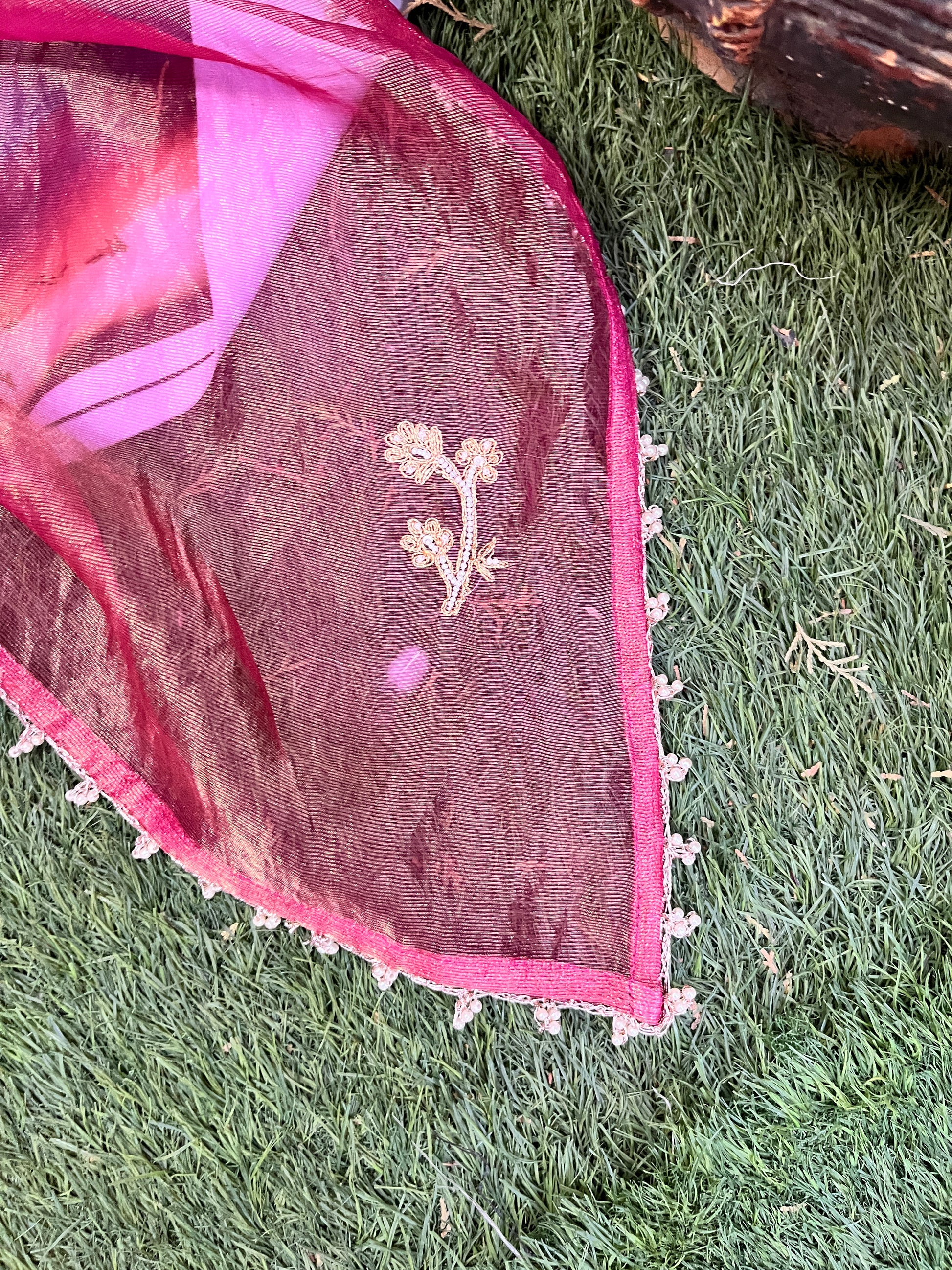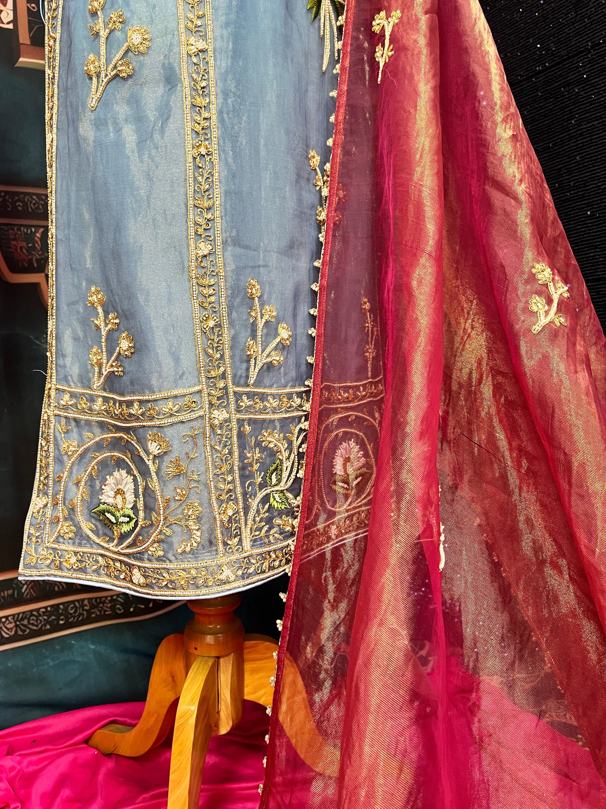 The matching tissue dupatta, detailed with fine embroidery, completes the look with timeless sophistication.