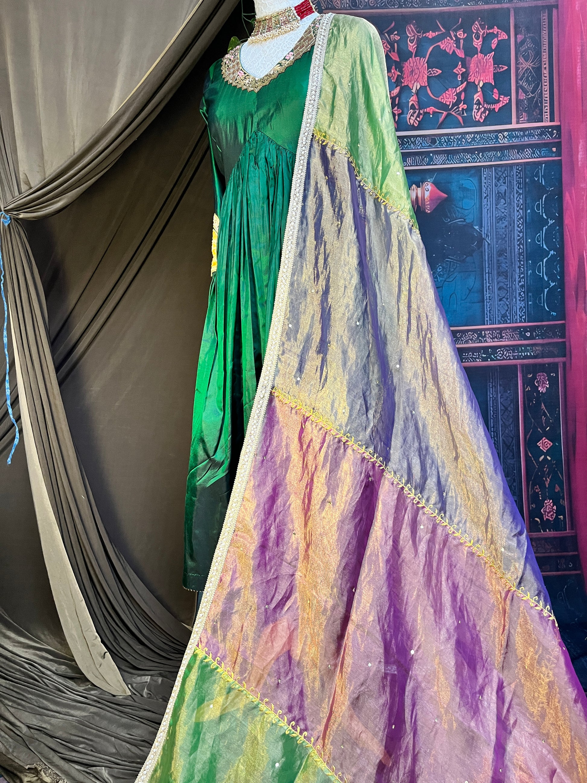 Step into timeless elegance with our Vibrant Festive Collection, featuring a luxurious green silk gathered Anarkali kurta designed to capture the essence of celebration. The silhouette flows gracefully, while the neckline and sleeves are adorned with intricate zardozi handwork, adding a royal charm to the ensemble.